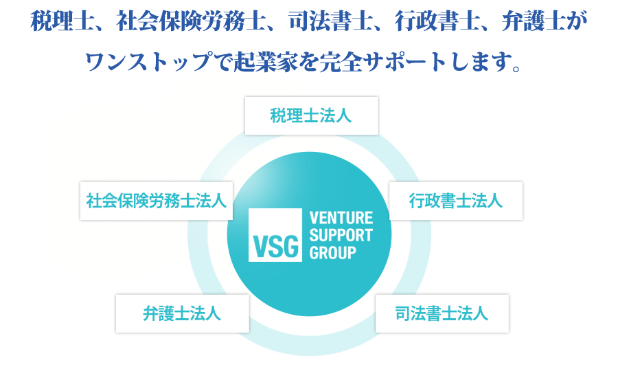 | グループ会社 | ・ベンチャーサポート社会保険労務士法人 ・VSG相続税理士法人 ・VSG司法書士法人 ・VSG行政書士法人 |