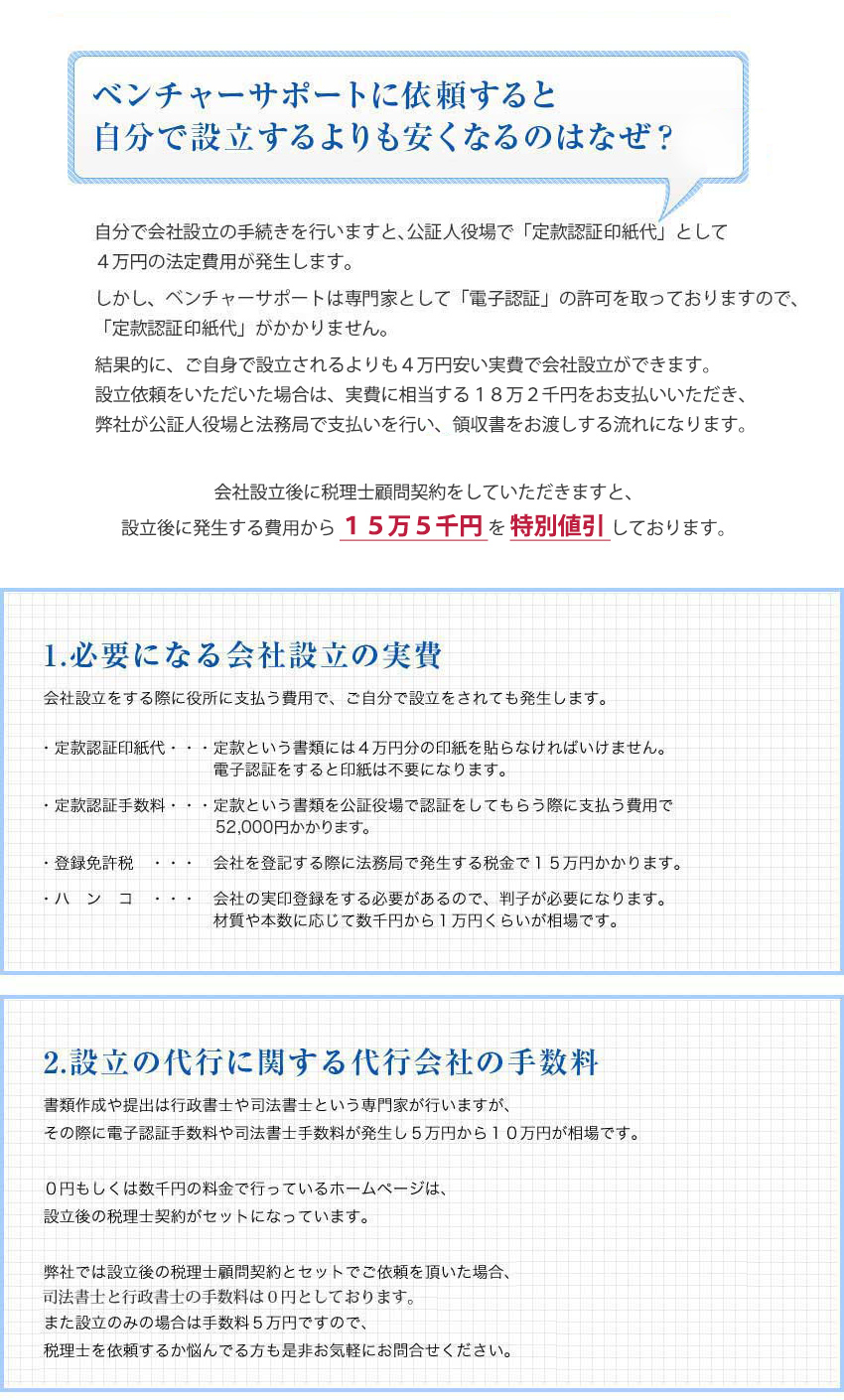 法人設立後に発生する費用から、15万5,000円の特別値引きあり。