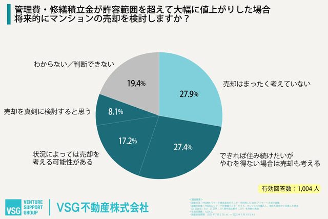管理費・修繕積立金が許容範囲を超えて大幅に値上がりした場合、「売却を真剣に検討すると思う」が8.1%、「状況によっては売却を考える可能性がある」が17.2%、「できれば住み続けたいが、やむを得ない場合は売却も考える」が27.4%であり、合計すると約半数が将来的な売却の選択肢を意識している。