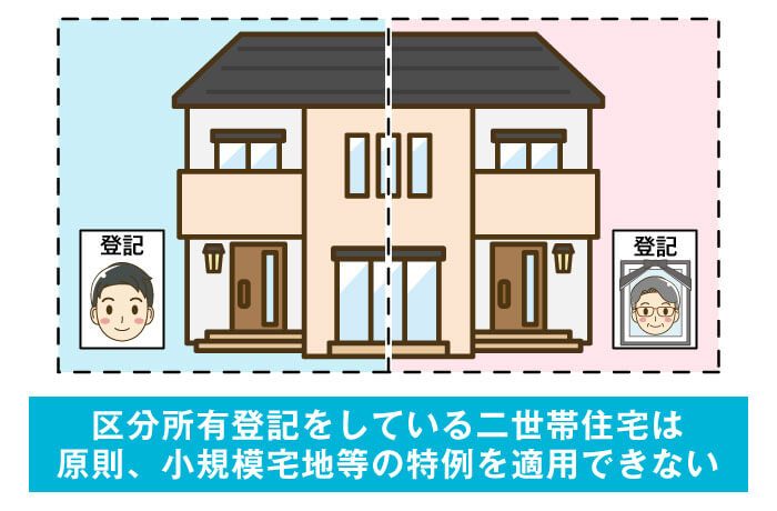ただし、小規模宅地等の特例の適用を受けられるのは、区分所有登記されていない二世帯住宅の場合です。区分所有登記されている二世帯住宅の場合は、原則として小規模宅地等の特例の適用を受けられませんのでご注意ください。