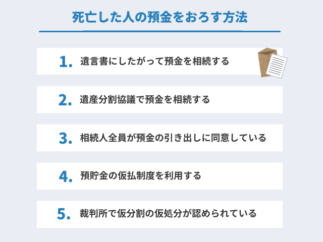 死後、つまり相続開始後に預金をおろす方法について解説します。