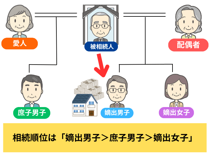 そのため、男子が優先され、嫡出女子よりも戸主が認知した庶出男子(私生児)のほうが相続順位が上となっていました。