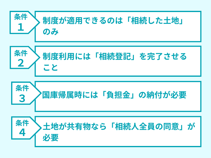 相続土地国庫帰属制度の利用・申請条件は下記のとおりです。
