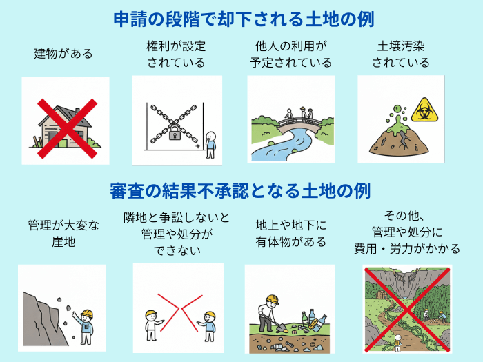却下要件(申請の段階で直ちに却下となる)や不承認要件(審査の段階で該当すると判断された場合に不承認となる)に該当する土地は、国に引き取ってもらえません。