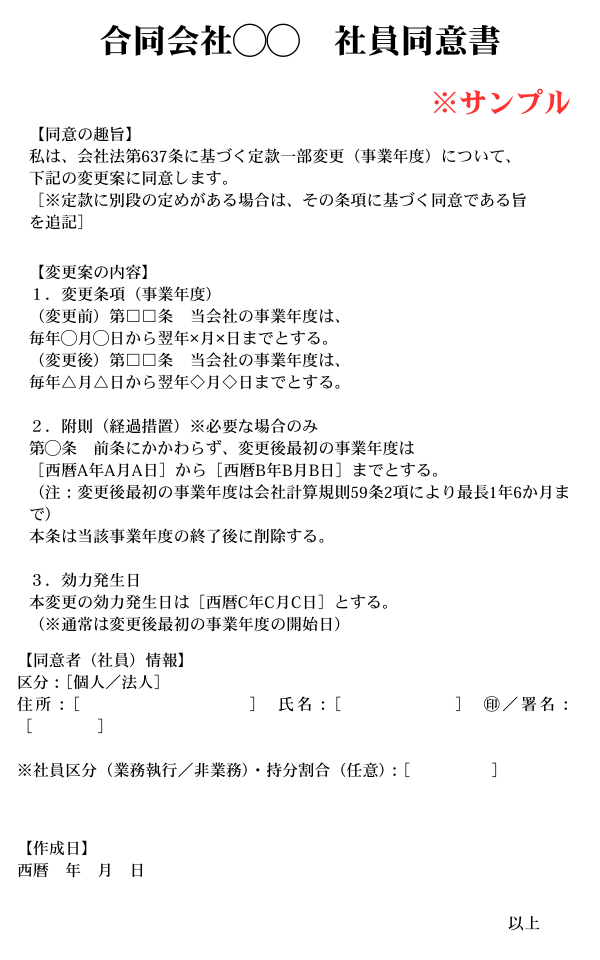 合同会社での定款変更は、社員総会などを開いて議事録を作成する以外に、総社員の同意書を作成するといった形式を取ることもできます。