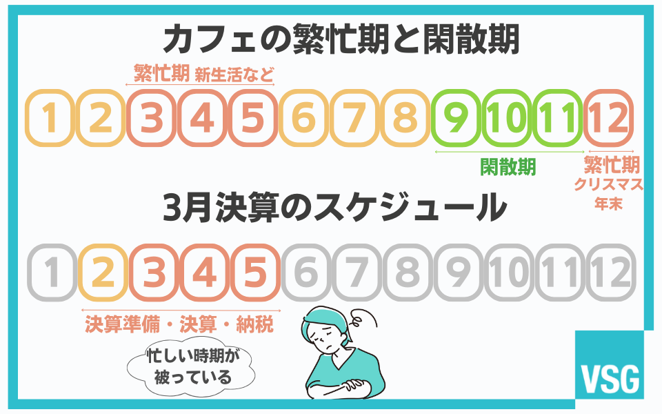 3月を決算期とすると、決算や納税といった業務を繁忙期と同じ3~5月に行うことになります。