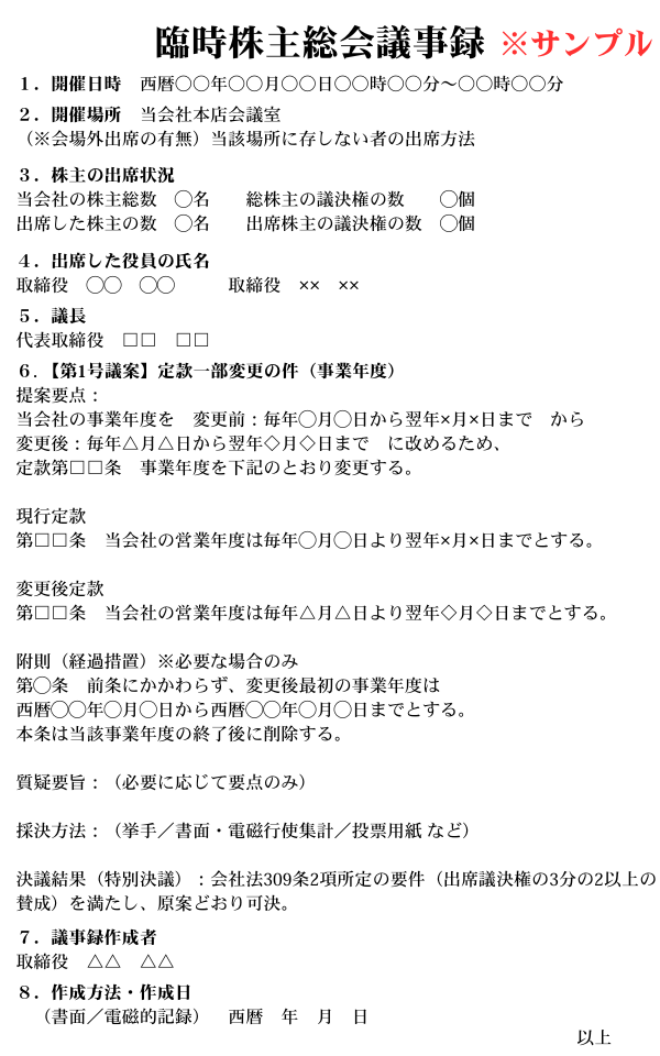決算期の変更について決議を行い、可決に至ったら、総株主数や出席株主数、変更する定款の内容などをまとめた株主総会議事録を作成します。