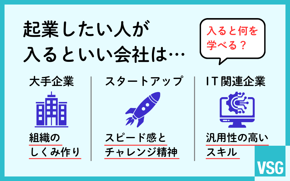 起業前に入る会社は、経営に活かせる学びを得る場ともいえます。たとえば、 大手企業、スタートアップ企業、IT・テクノロジー関連企業は、その手の学びを得やすい環境です。