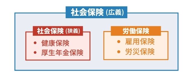 一般に「社会保険」というと狭義の社会保険(健康保険・厚生年金保険)を意味します。ただ、労働保険(雇用保険・労災保険)も含めて「社会保険」と呼ばれることもある点は覚えておきましょう。