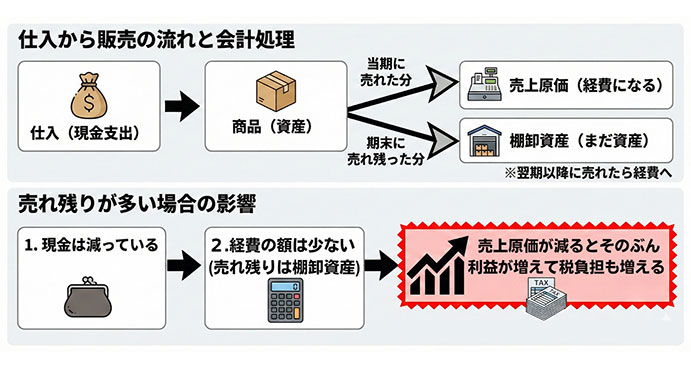 つまり、売れ残りが多いと、仕入れ代金を支払って現金は減っているのに、会計上は経費が少なくなり、結果的に税負担が増える可能性があります。