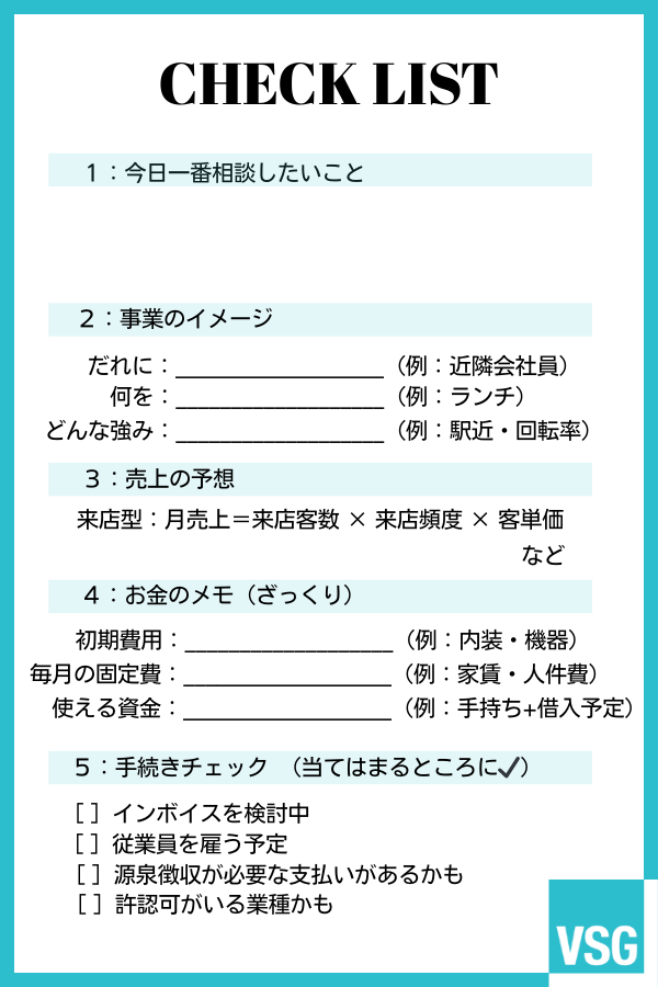 相談の効果を最大限に引き出し、具体的な次の一歩につなげるために、以下のチェックシートを参考に、事業計画を事前に整理しておきましょう 。