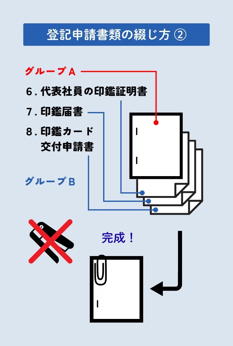ステップ5で解説したとおり、登記書類は大きく2つのグループ(A:ホチキス留めをする書類、B:ホチキス留めしない書類)に分けられます。