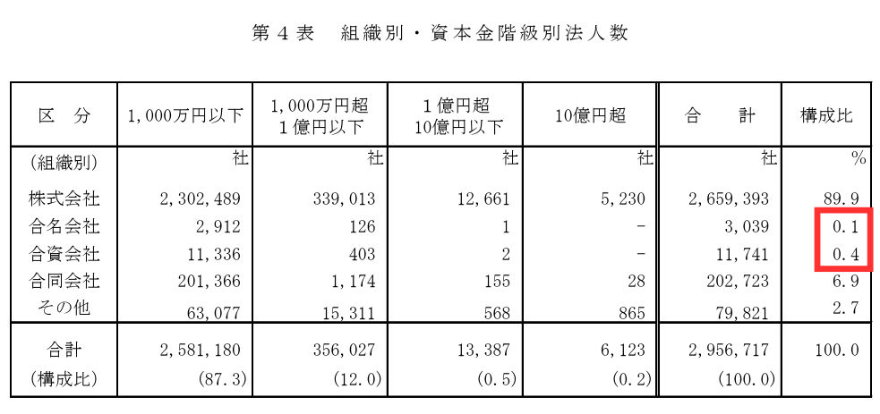 令和5年の時点で、全法人のなかで合名会社は0.1%、合資会社は0.4%しか存在しません。