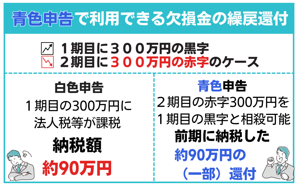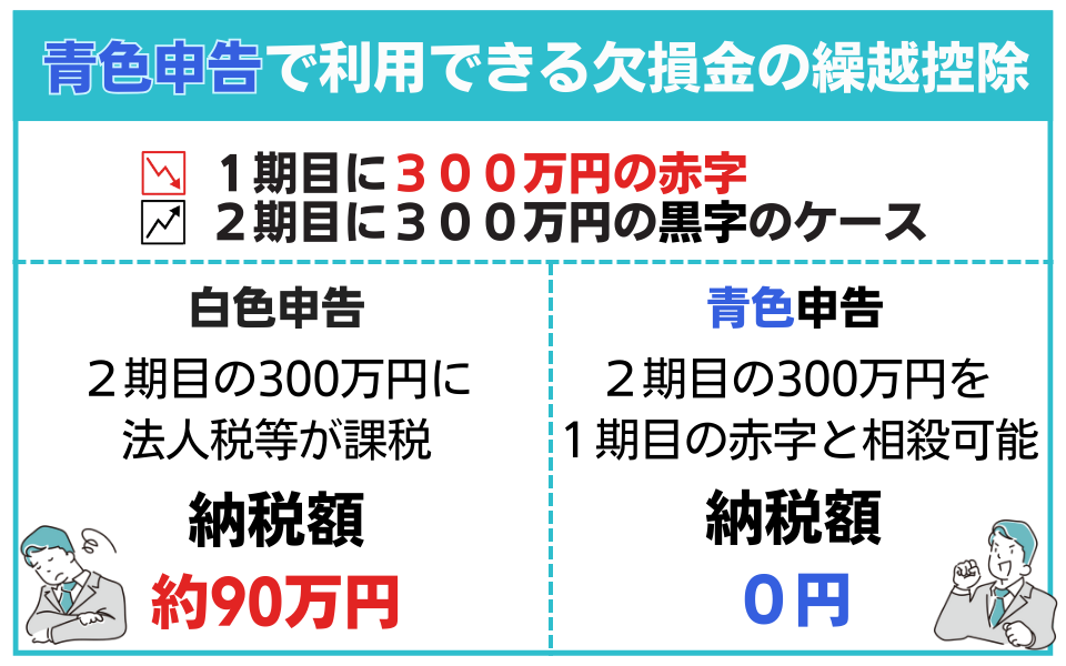 一方で青色申告であれば、欠損金の繰越控除により、2期目の黒字と1期目の赤字を相殺できます。