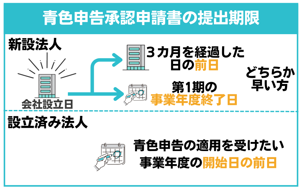新設法人の場合、申請期限は「会社を設立した日から3カ月を経過した日の前日」と「第1期の事業年度終了日」のうち早い方になります。