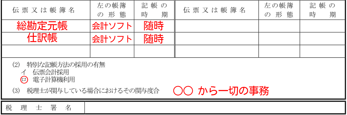 税理士が関与している場合におけるその関与度合には、実態に応じて「総勘定元帳から一切の事務」「伝票整理から一切の事務」といったように記入します。