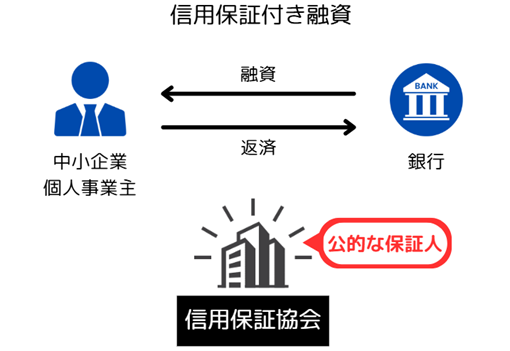 信用保証付き融資とは、金融機関から融資を受ける際、信用保証協会が公的な保証人になる仕組みです。