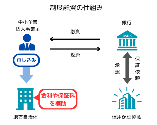 制度融資は、自治体と金融機関と信用保証協会の3つの機関が連携して行う融資制度です。