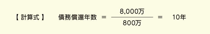 - 債務償還年数=8,000万÷(500万+300万)=10年