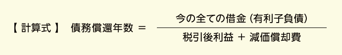 - 債務償還年数=(有利子負債の合計)÷(税引後利益+減価償却費)