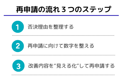 銀行が再申請で注目するのは、前回からの変化です。同じ数字・同じ資料のままでは結果は変わりません。財務内容・納税状況・信用情報など、数値で改善を示すことが重要です。 - STEP3改善内容を可視化して再申請する