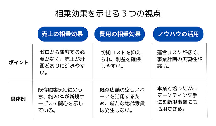 金融機関が新規事業の融資で評価する相乗効果は、次の3つに整理できます。