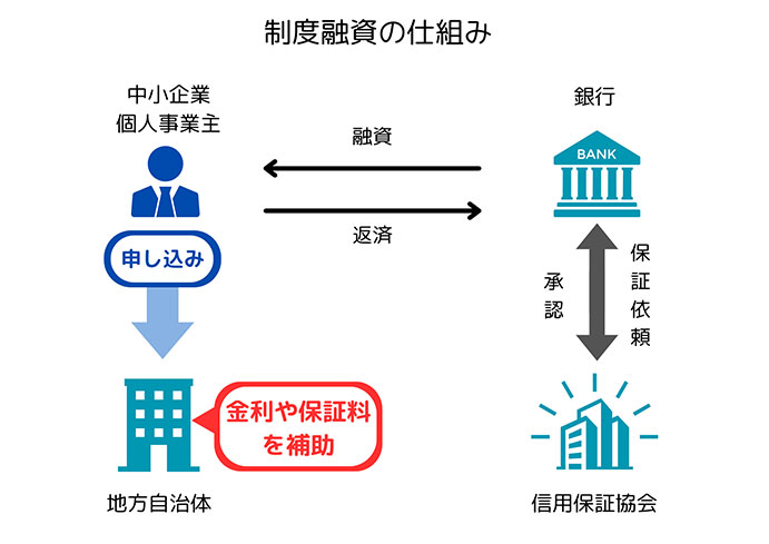 制度融資とは、自治体・金融機関・信用保証協会の3者が連携して提供する融資です。
