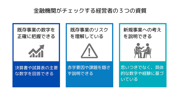 金融機関が確認するのは、新規事業の見通しだけではありません。