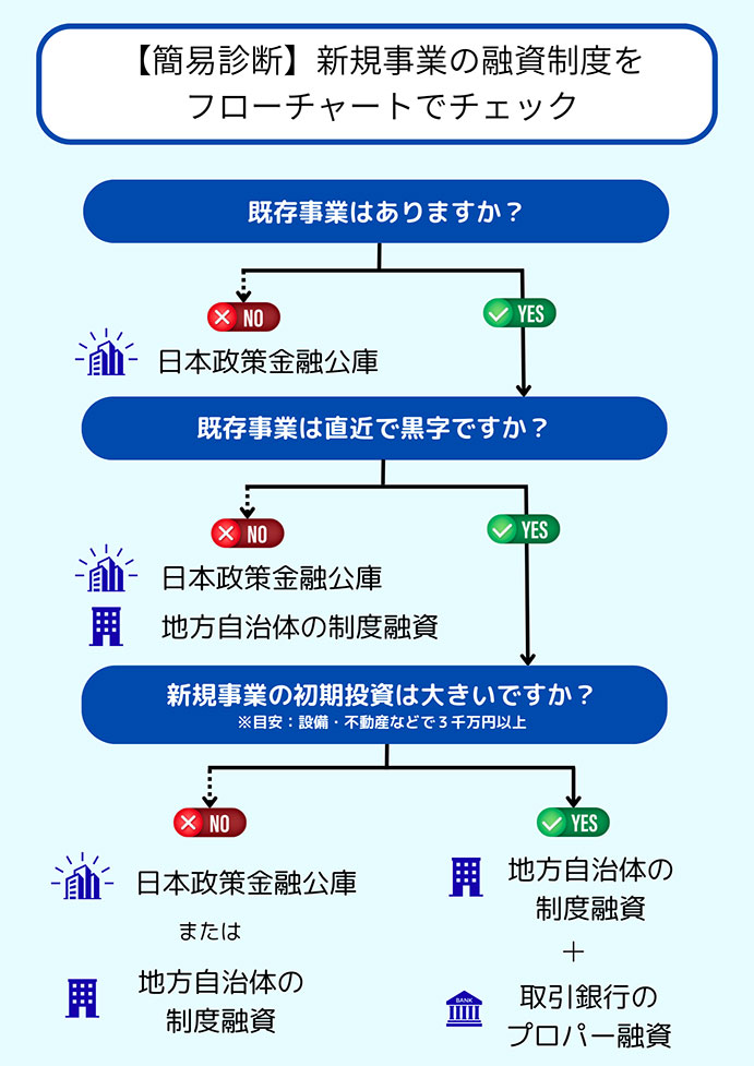 そこで、質問に沿って進むだけで自分に合った融資制度が分かる簡易診断フローを用意しました。